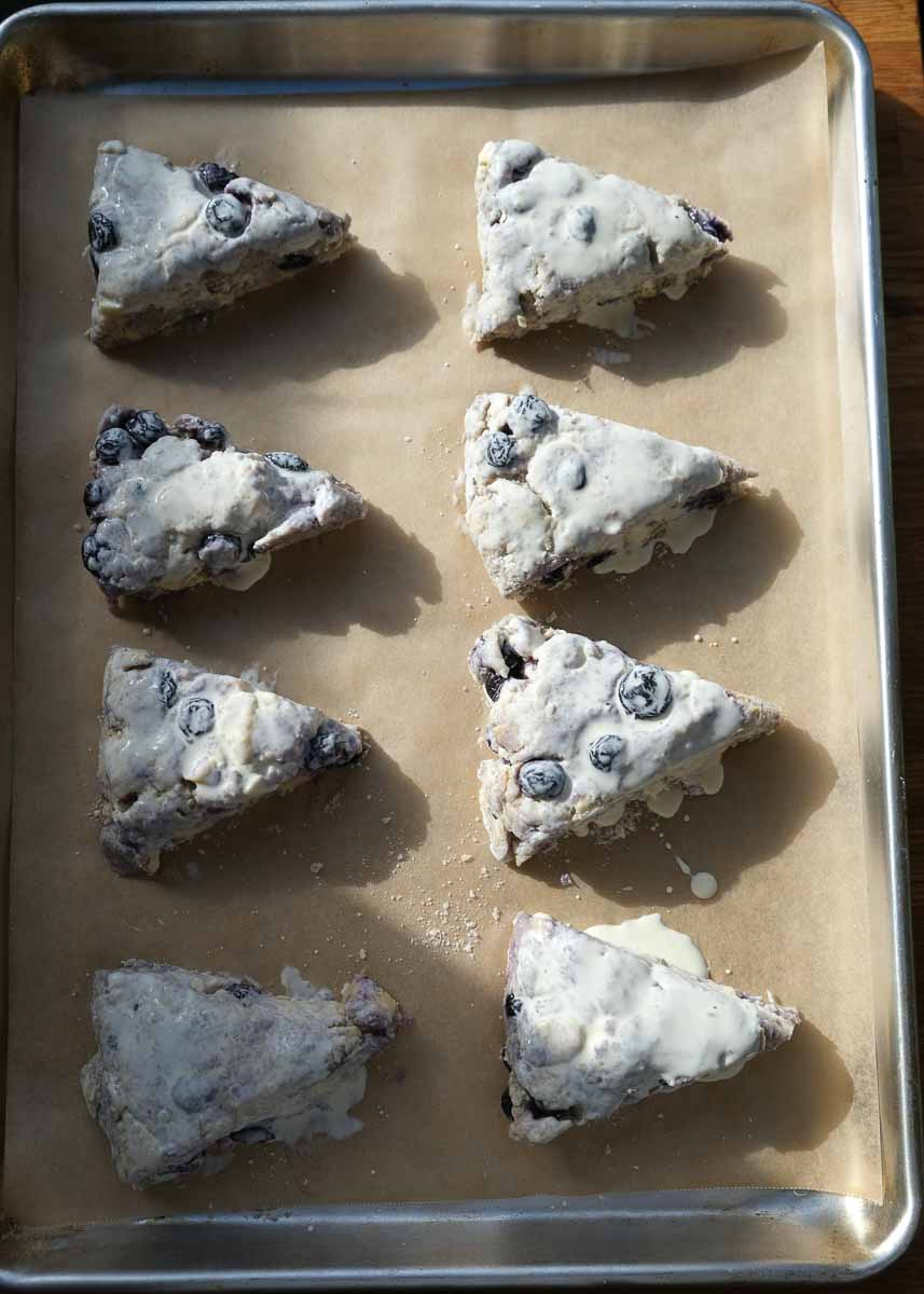 - Using a bench scraper or a knife, cut the dough into 8 even triangles. Carefully transfer each piece to the baking tray. Get a brush and brush the extra ¼ cup of cream over the scones.