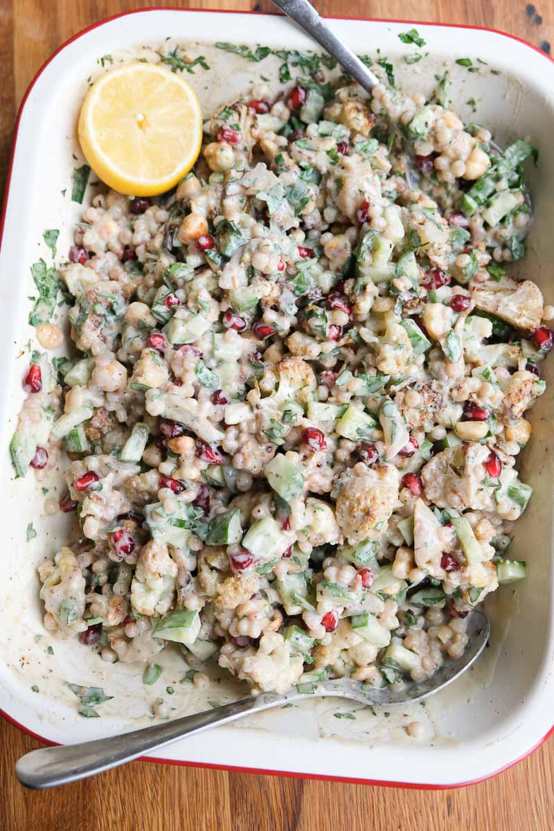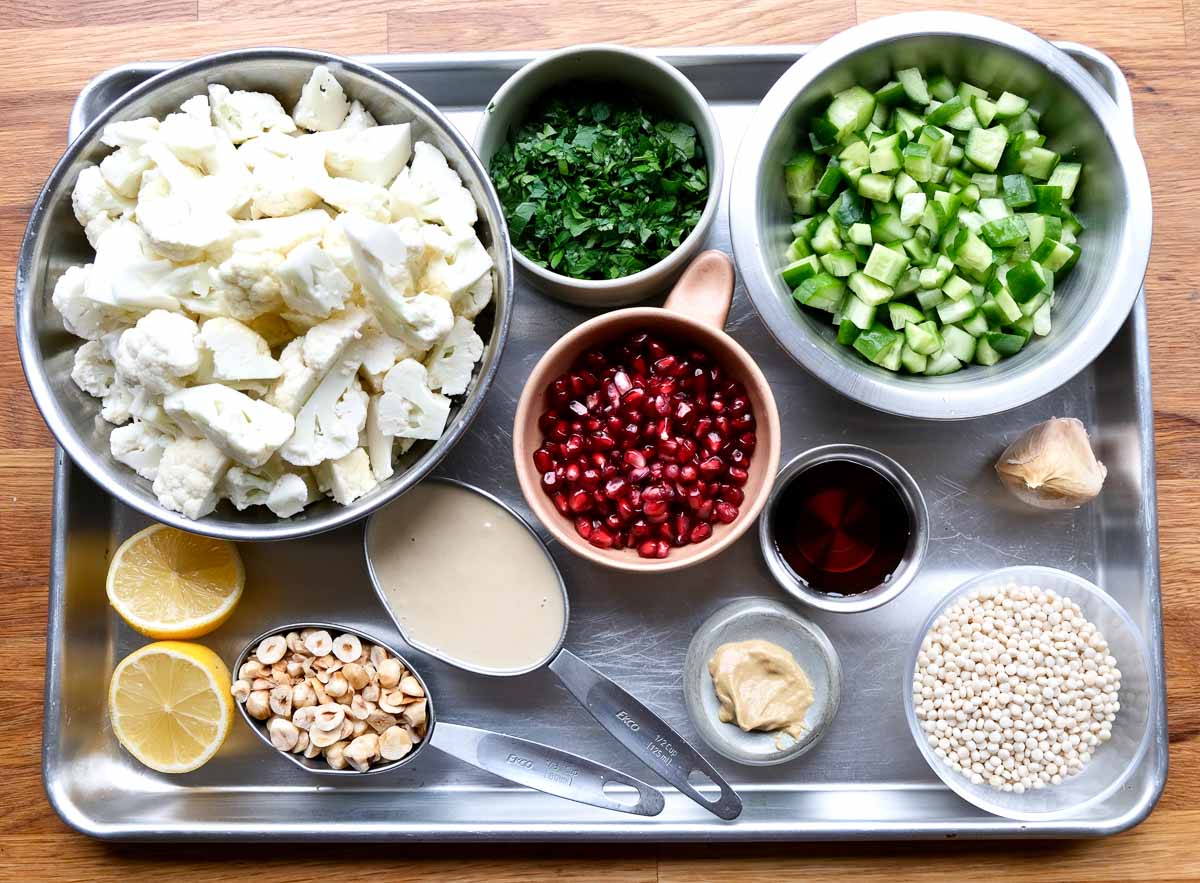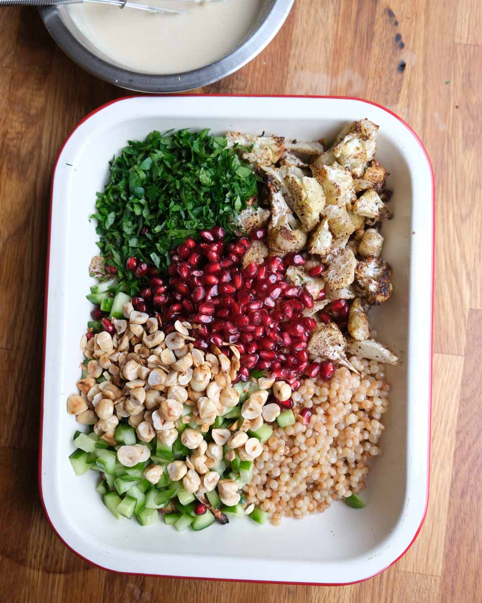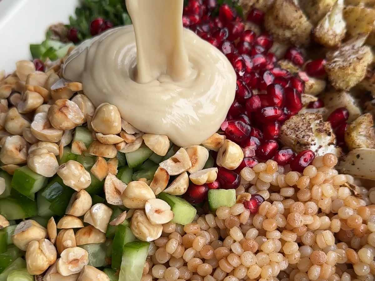 - Once the cauliflower is cooked, assemble the salad by adding cauliflower, cucumber, hazelnuts, couscous, pomegranate, and parsley to a large bowl.