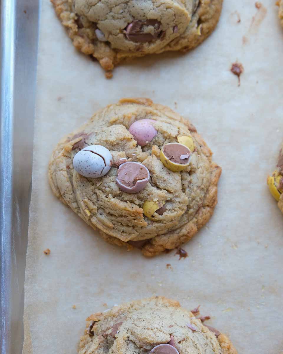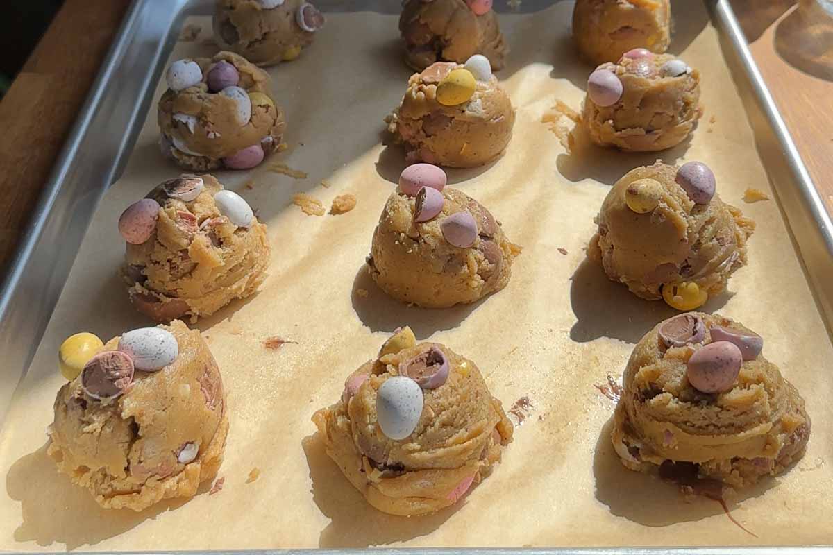 - Line a large baking tray with baking paper and scoop 12 balls of cookie dough evenly over the tray. You can roll these into perfect balls but I left them looking a little more rustic. Press the remaining mini eggs into the top of the dough balls.