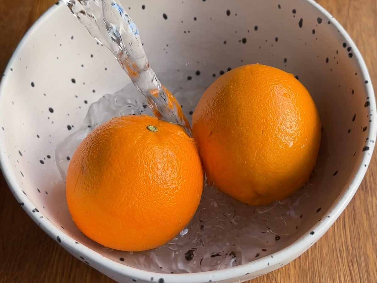- Poke holes in the oranges and boil for 10 minutes. I boiled them in the microwave by adding them to a bowl, filling it up with water and microwaving for 10 minutes. Once the oranges are soft, remove them from the water and cut up into chunks. Remove any seeds and if you want them to cool down quickly place them in the fridge.