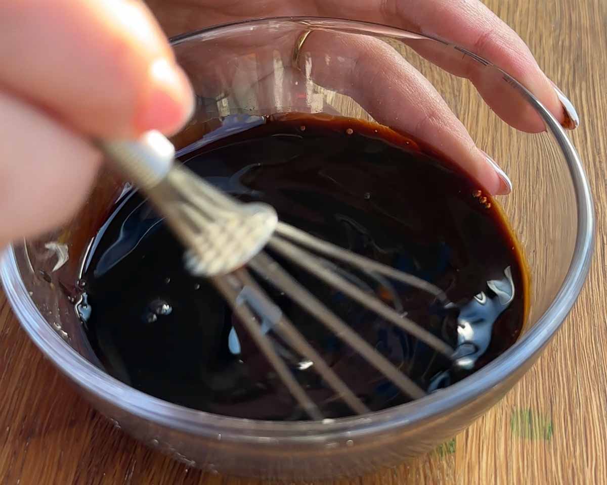 - Whisk together the sugar, soy sauce, dark soy and vinegar until the sugar is dissolved and set aside.
