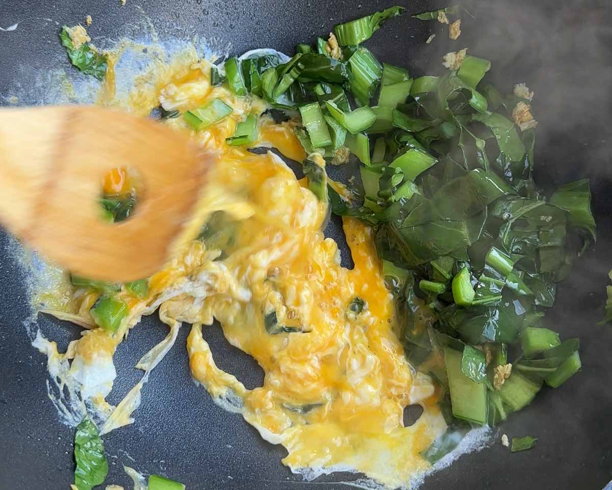 - Step 2: Sauté the garlic and greens then scramble some eggs.