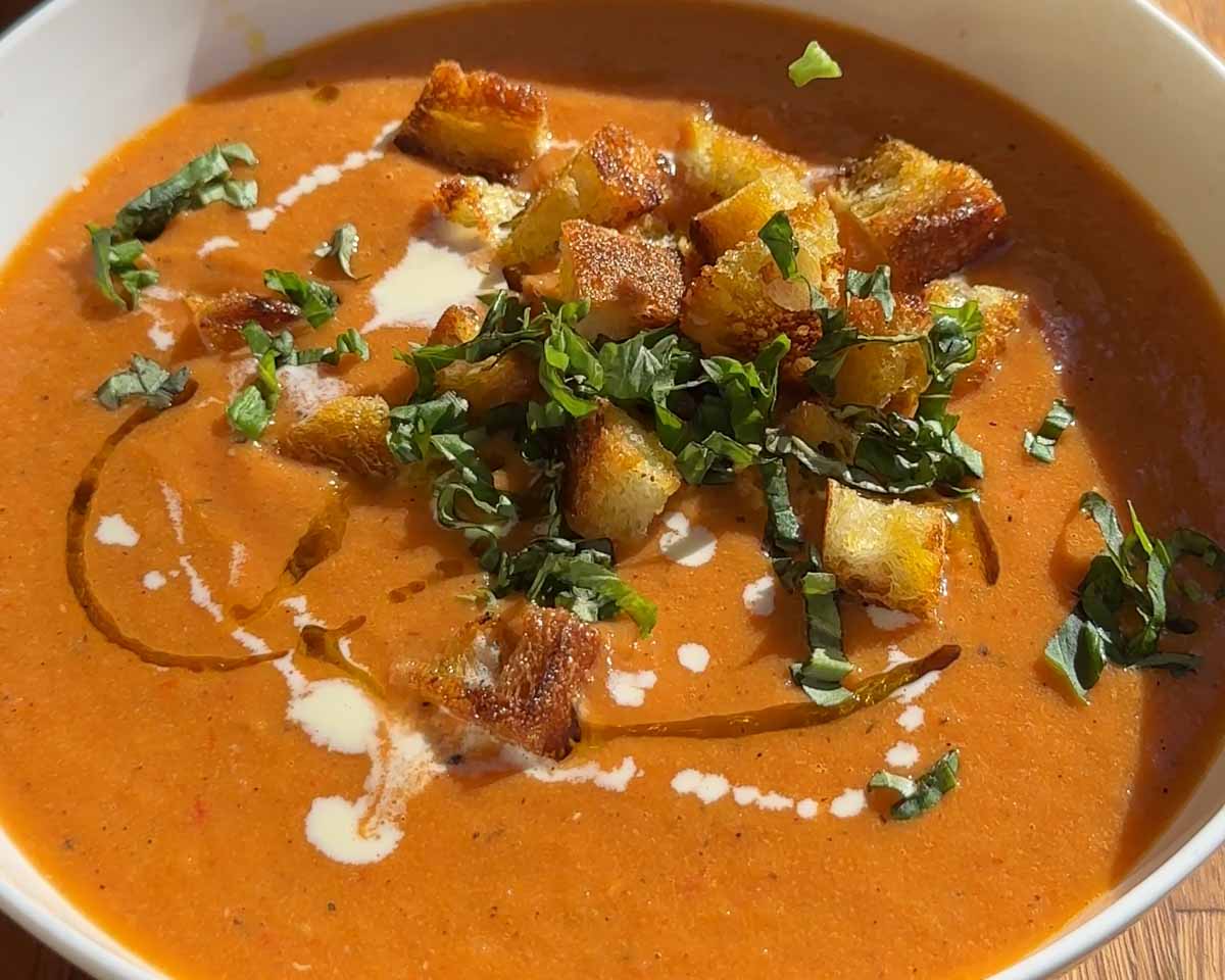 - Top with croutons, basil and also highly recommend serving with a cheese toastie. Enjoy!