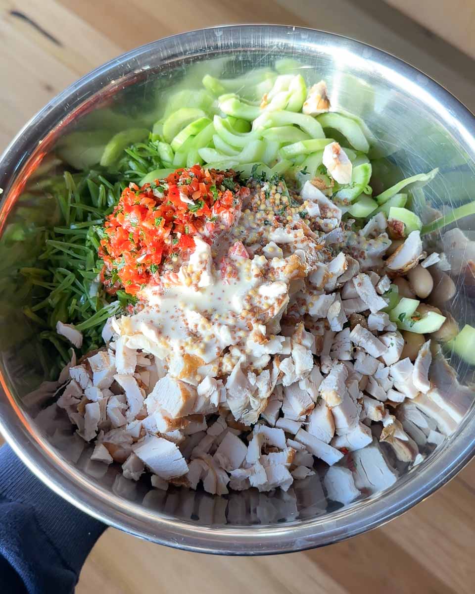 - Drain, rinse and dry beans and add to a large mixing bowl along with the parsley mix, chicken, the thinly sliced snow peas and cucumber. Either finely chop the roasted capsicum or add to food processor and pulse a few times, then add to the bowl with the beans, chicken etc.