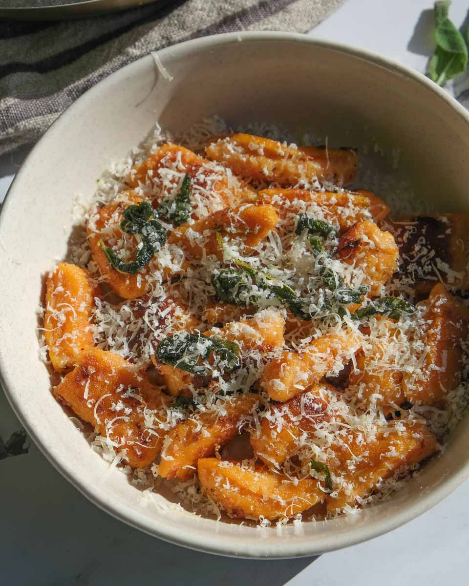Sweet Potato Gnocchi is a simple and delicious homemade dish that combines the natural sweetness of sweet potatoes with the savoury flavours of sage and parmesan.