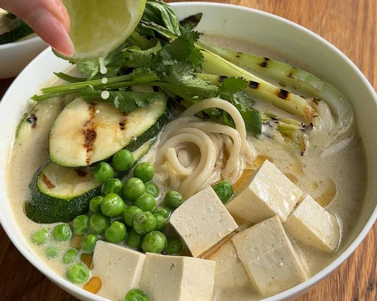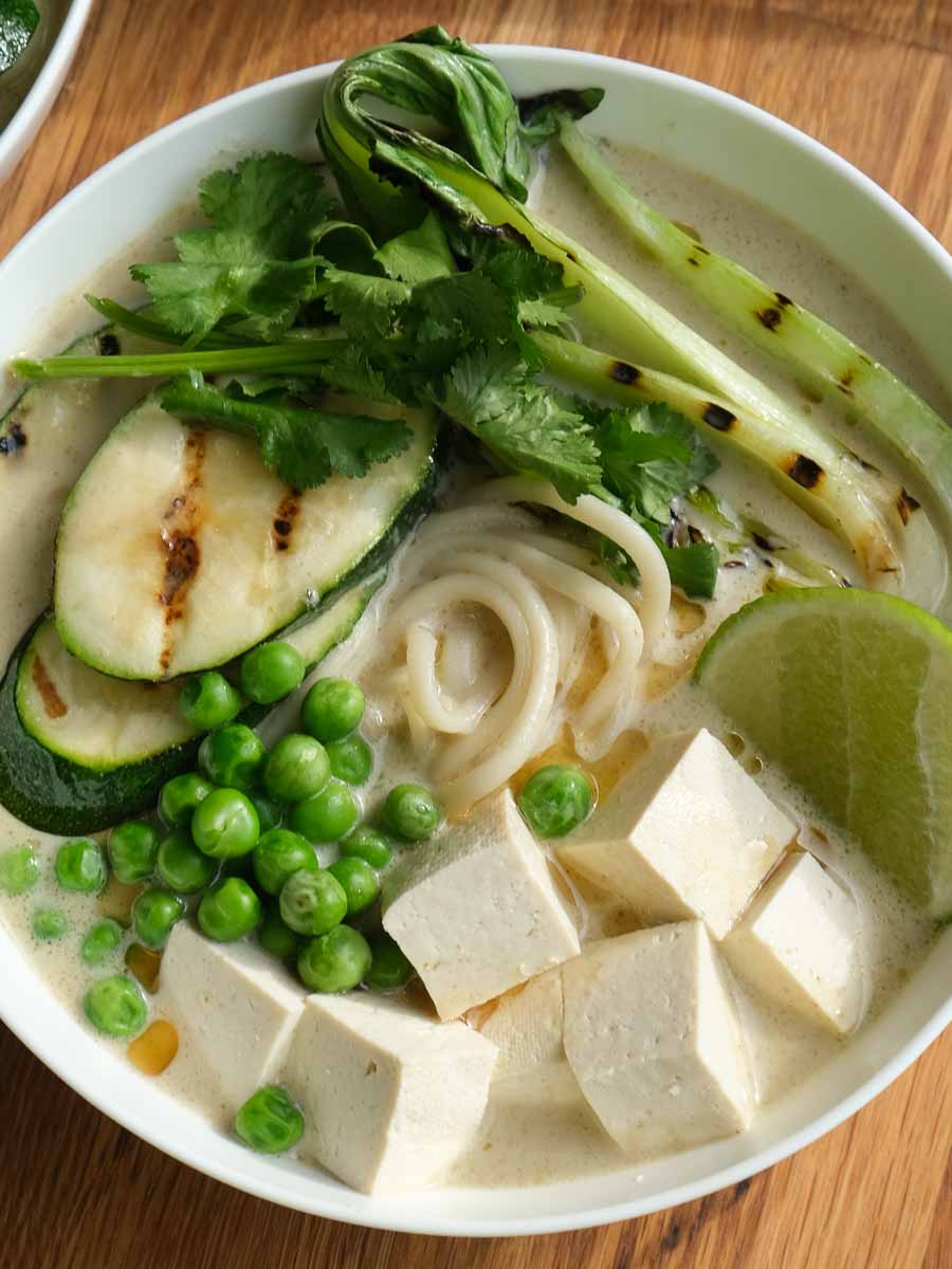 - Place half the noodles, veggies and tofu in two bowls. Pour over the green curry broth over the noodles and veggies. Top off with an extra little drizzle of sesame oil, a squeeze of lime and some fresh coriander. Enjoy!